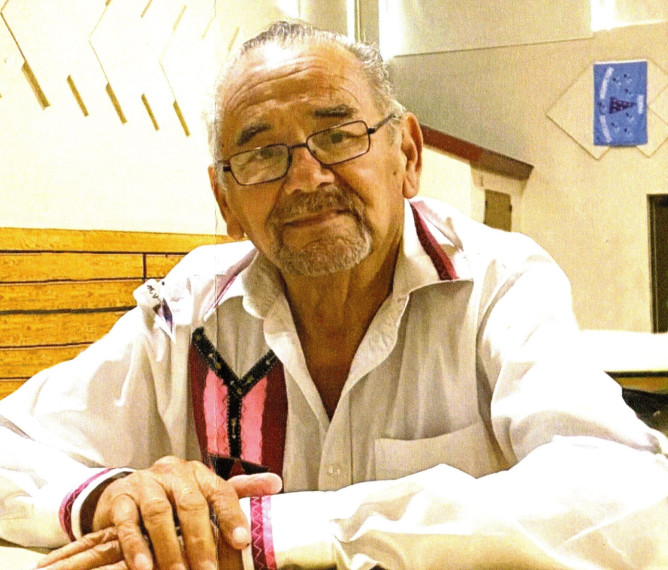 Russell Smith’s funeral on Jan. 26, 2023, was the first Dakota funeral I have attended. The other indigenous funerals I attended were West River Lakota Funerals. There were some similarities in the set-up with star quilts hanging on the wall at the front of the room, tables with flowers and photos on either side of the deceased, and a drum group in one corner at the front who sang at various times during the ceremony. What was different was that Russell’s body was wrapped in a buffalo robe on a wooden platform on a bier at the front, while the Lakota funerals I’ve attended have had open coffins often with a sweet grass braid and/or sage inside. The Lakota funerals have had tables on the sidewalls near the front with decorated sheet cakes on them. If the person was in the military, the sheet cake might have the logo from his branch of the service on it or there might be a picture of the person spray painted with icing on top of the cake. There was just one table on the side at this funeral and it had packages of cookies on it.